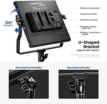 This bi-color LED light has 660 pieces of LED beads, with 330 white and 330 yellow bulbs that illuminate a variable white balance from Tungsten-Daylight 3200-5600K Color Temperature. It has two power options: powered with Sony NP-F550 NP-F970 Li-ion battery for wireless operation (battery sold separately) or powered with AC adapter (included).