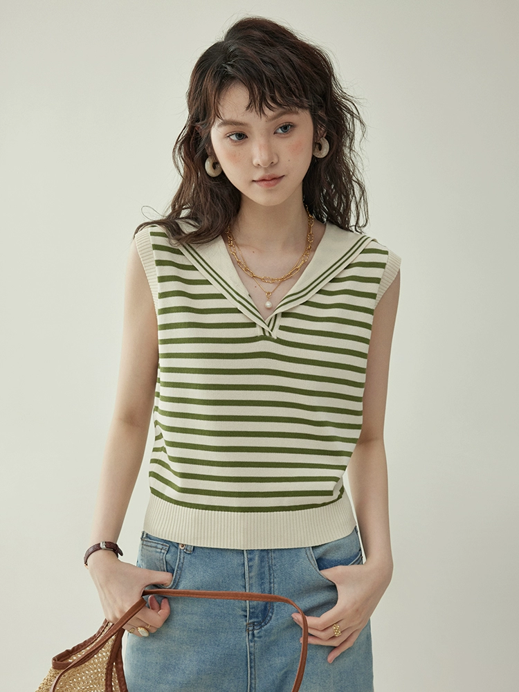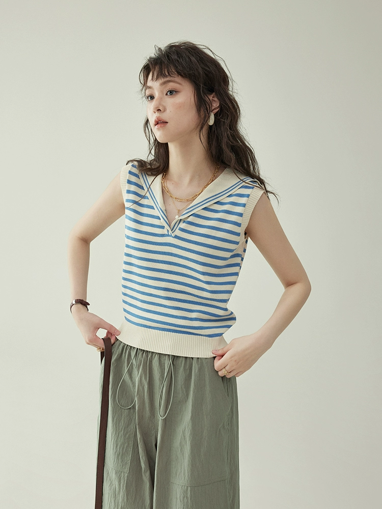 "Kitashima AMUU" Japanese blue striped navy collar casual sleeveless sweater for women's summer all-match slim top