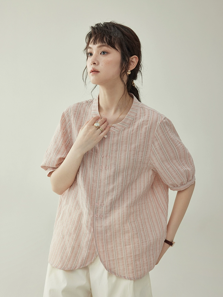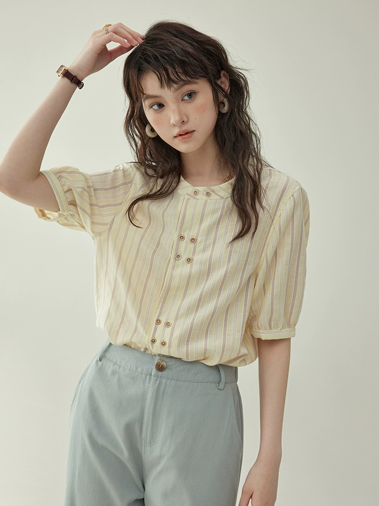 | nameOriginal | "Kitashima AMUU Original" French stand-up collar double-breasted striped short-sleeved shirt for women's summer all-match casual top |