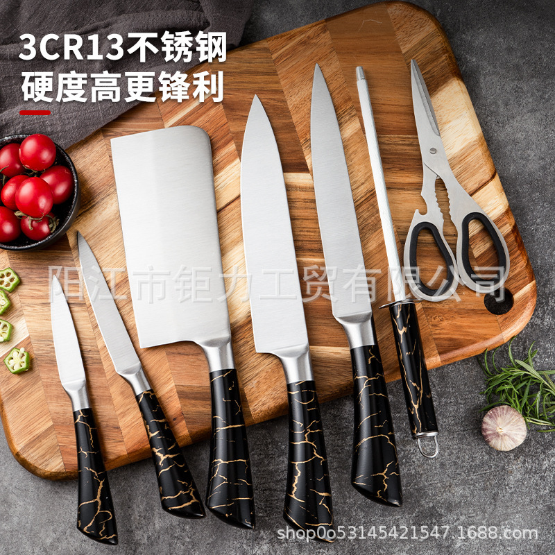 | nameOriginal | Kitchen knife set 8-piece knife set gift knife set household kitchen wooden rack stainless steel hollow horseshoe handle set knife |