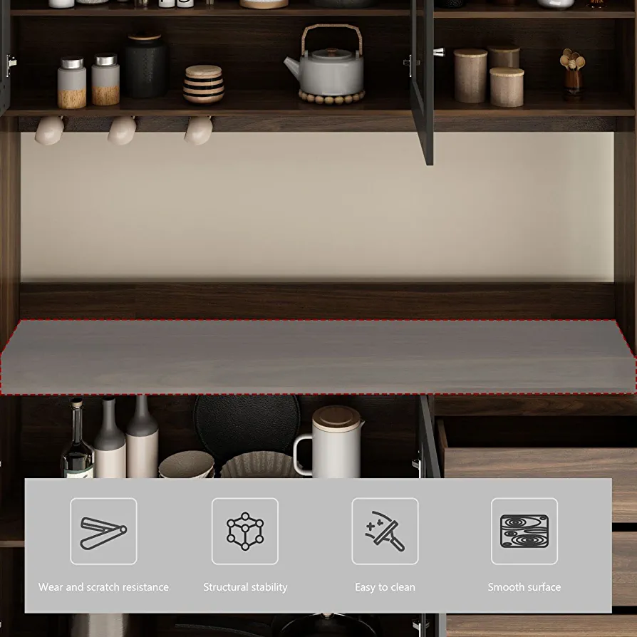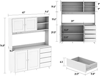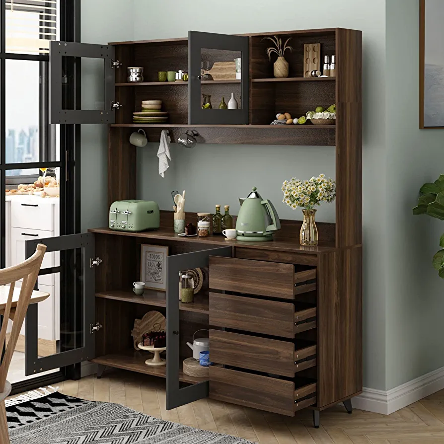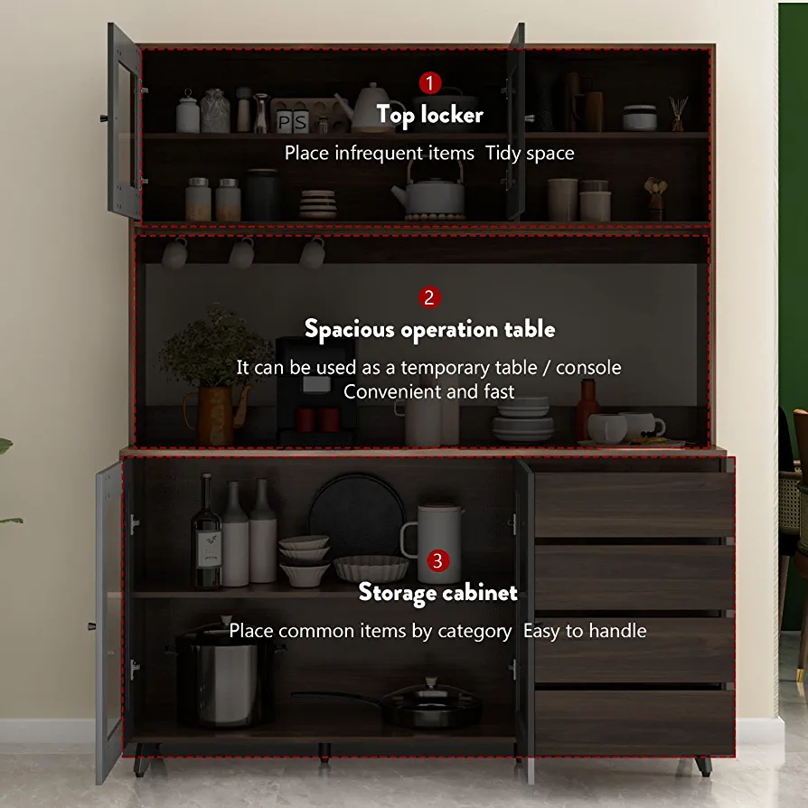 This kitchen hutch storage cabinet is designed to keep your belongings organized and easily accessible. With multiple layers and varying sizes of storage, you can store your items in an orderly fashion. The cabinet features two glass doors that protect your belongings from dirt and ash. The middle hutch storage offers a spacious countertop of 60.9 inches, perfect for using your blender, microwave, or coffee machine. The cabinet also comes equipped with knob hooks for hanging towels, spoons, cups, or scissors.