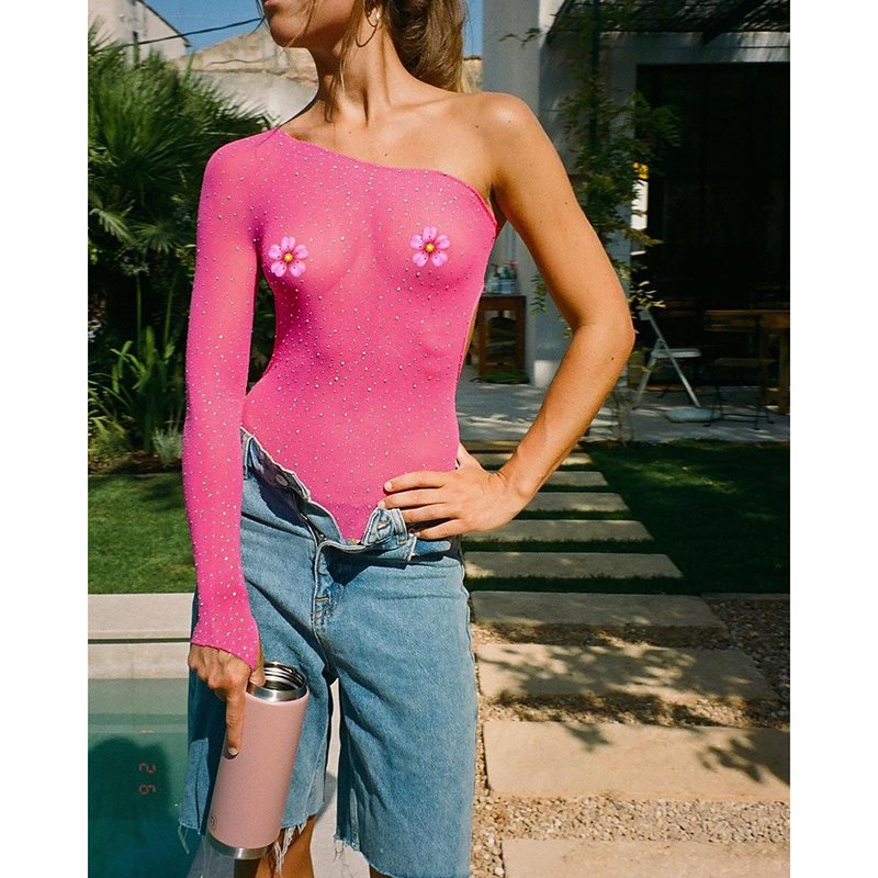KKX Street Spice Girl Hollow Backless Rhinestone Long-sleeved jumpsuit Y2K Sexy Slant Collar Shoulder Slim Base Top