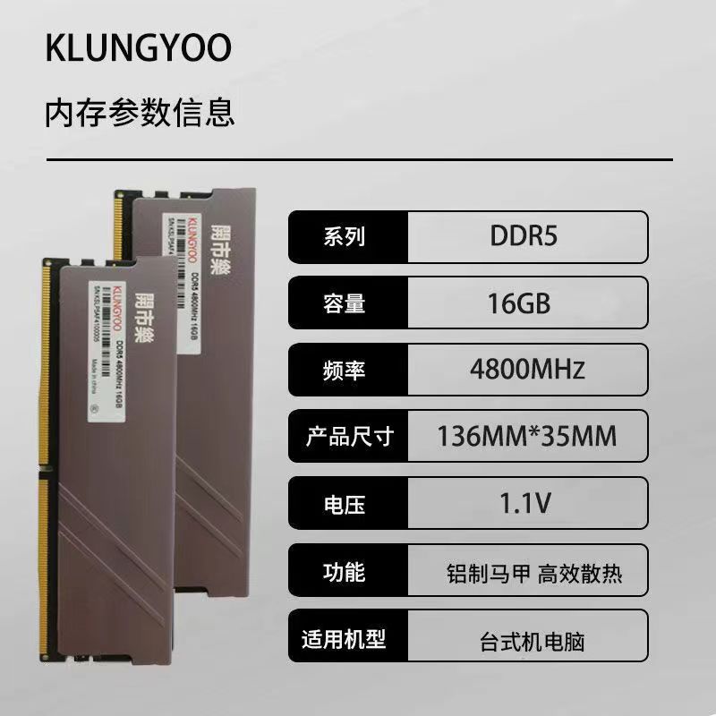 | nameOriginal | KLUNGYOO/kaixinle DDR5 desktop memory bar 16G4800 brand new and fully compatible |
