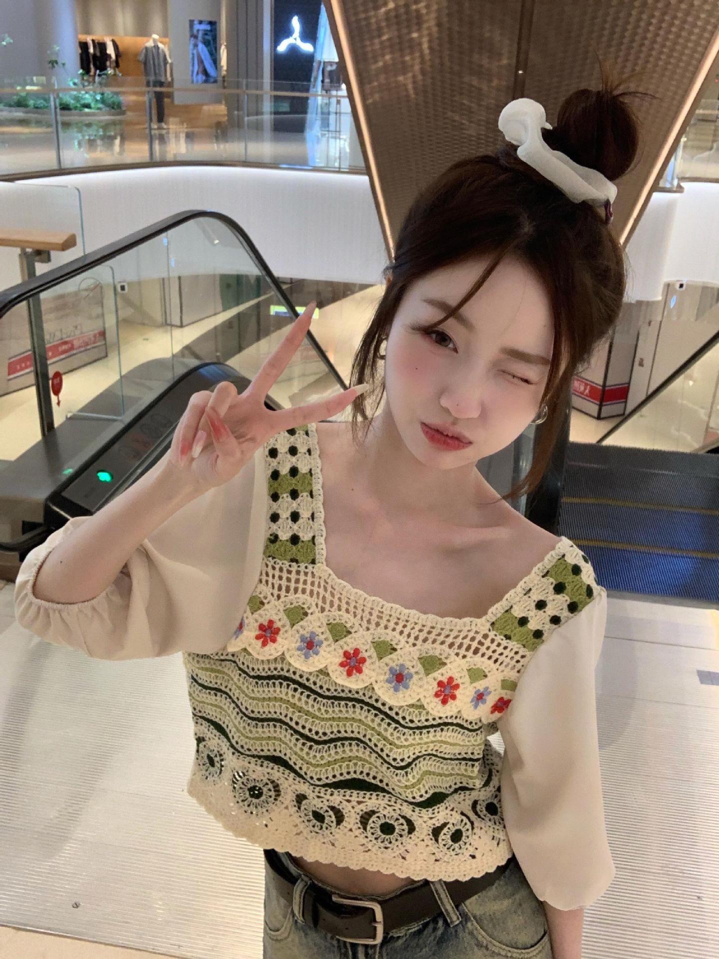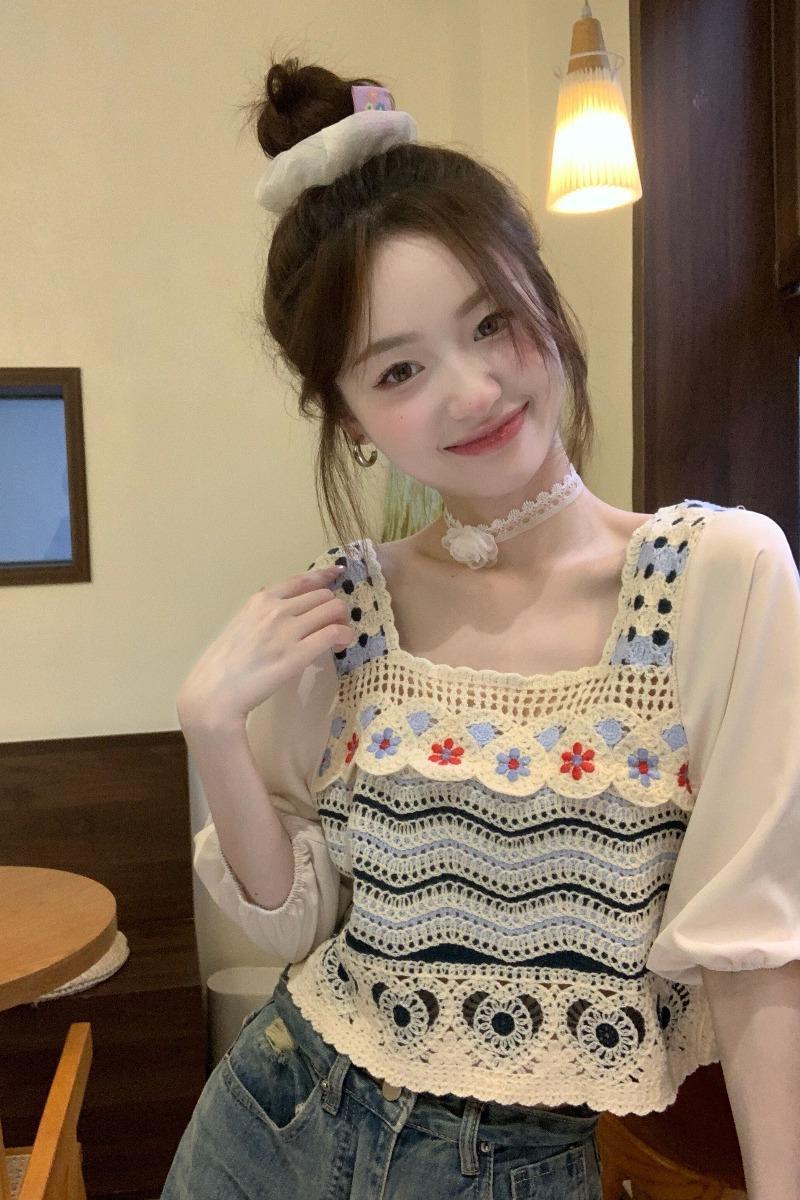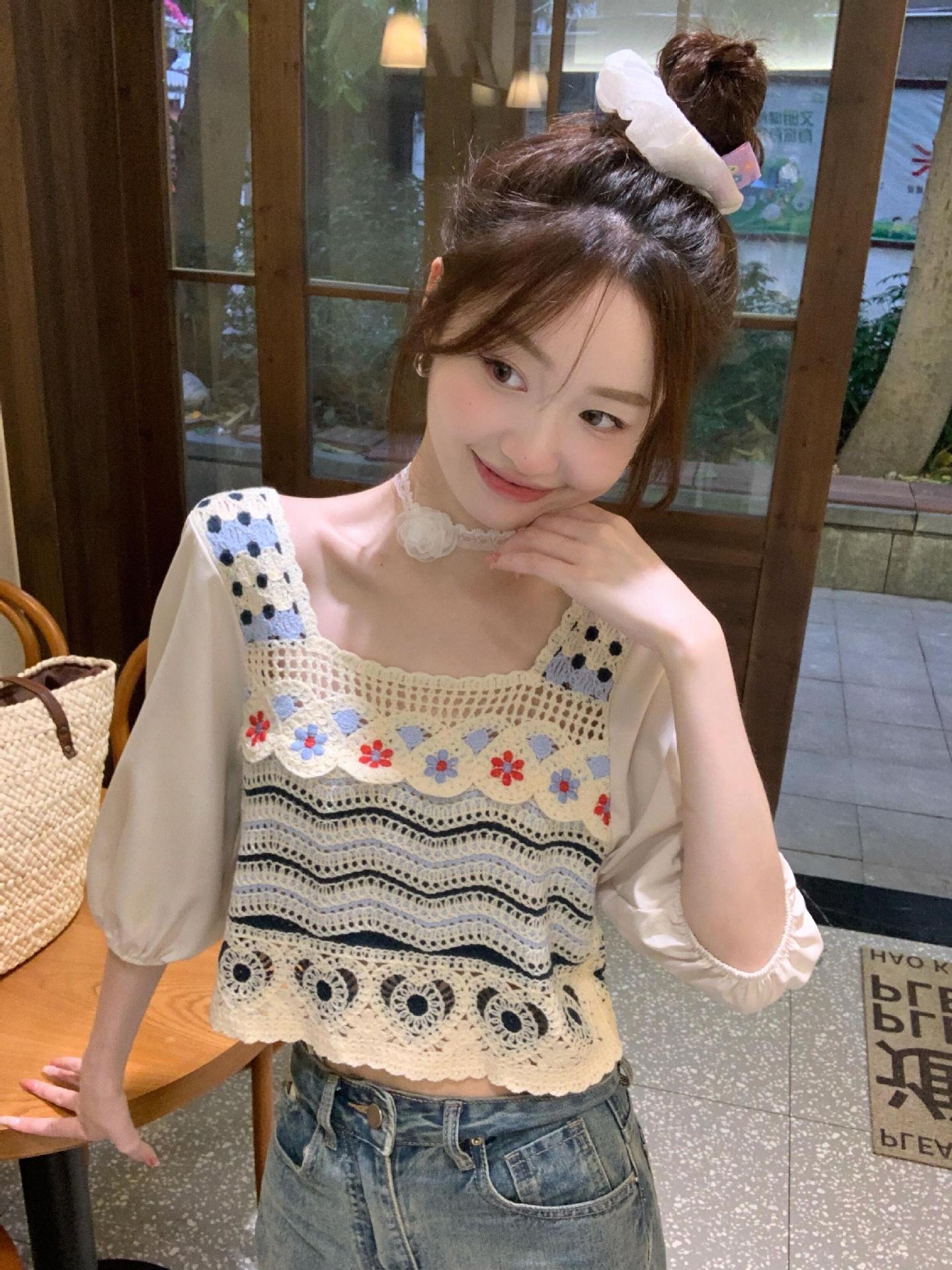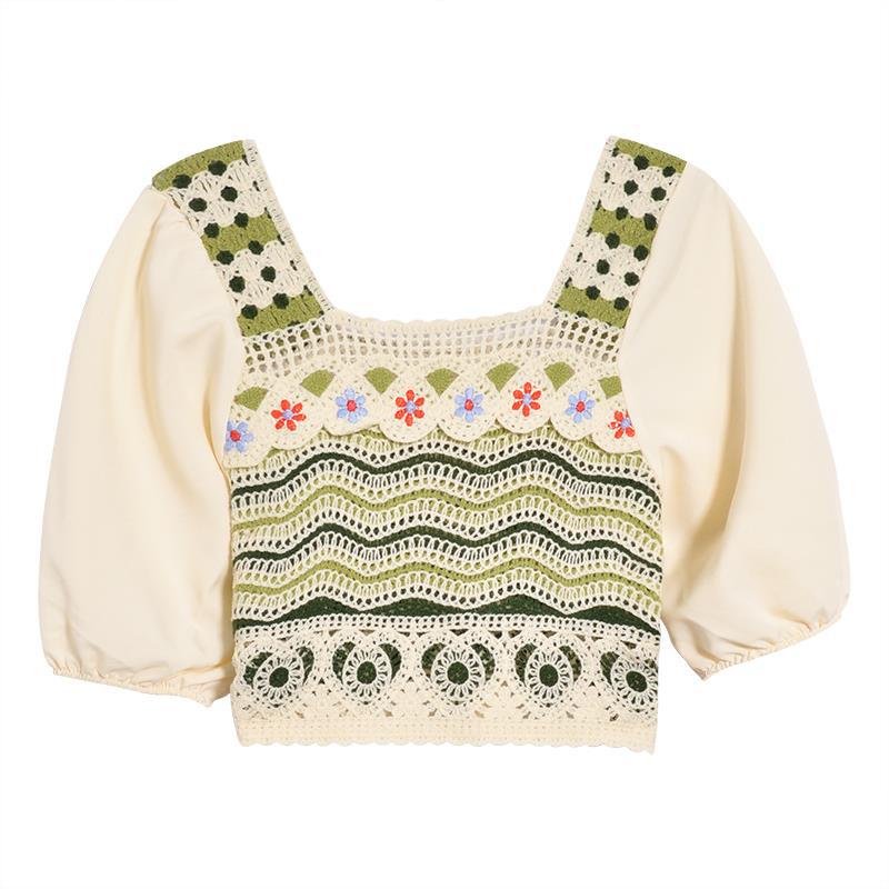 Knitted Academy-style Hollow Crochet Sweater Women’s Summer New Design Sense Outer Wear Short-sleeved Square Collar Thin Top for Women