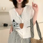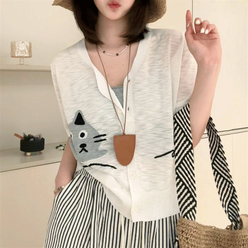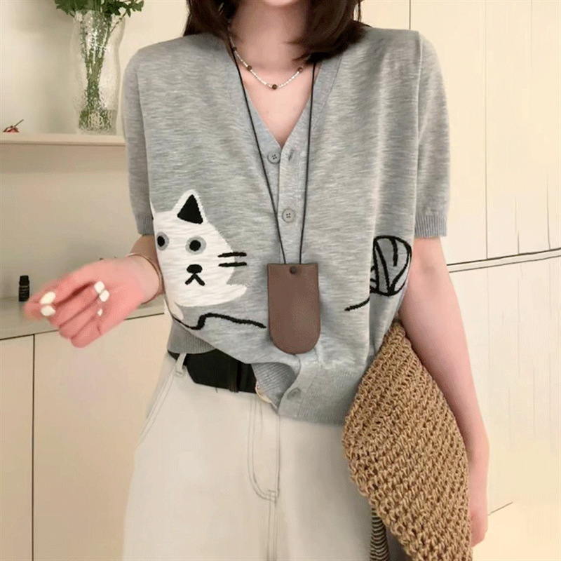 | nameOriginal | Knitted Cardigan Thin Women's Ice Silk Knitted 2024 Women's Summer New V-neck Printed Knitted Short-sleeved Women's Top |
