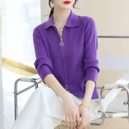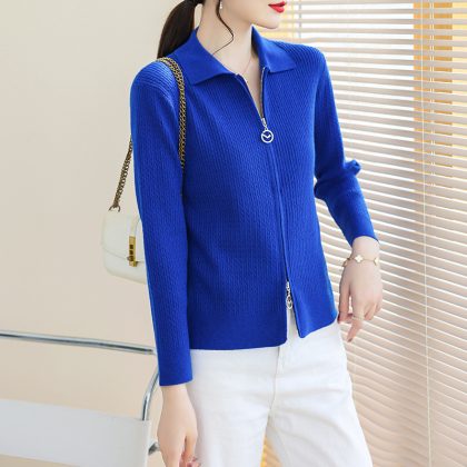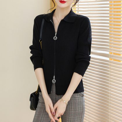 Knitted Cardigan Women’s Solid Color Zipper New Spring and Autumn Clothes Middle-aged Mother Small All-match Sweater Square Collar Jacket