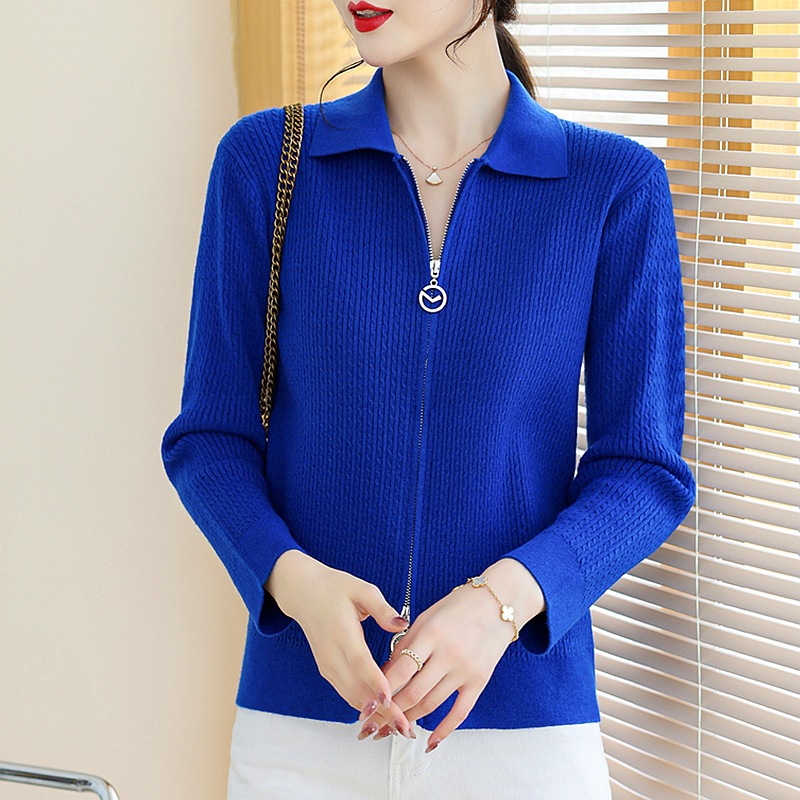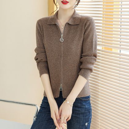 Knitted Cardigan Women's Solid Color Zipper New Spring and Autumn Clothes Middle-aged Mother Small All-match Sweater Square Collar Jacket