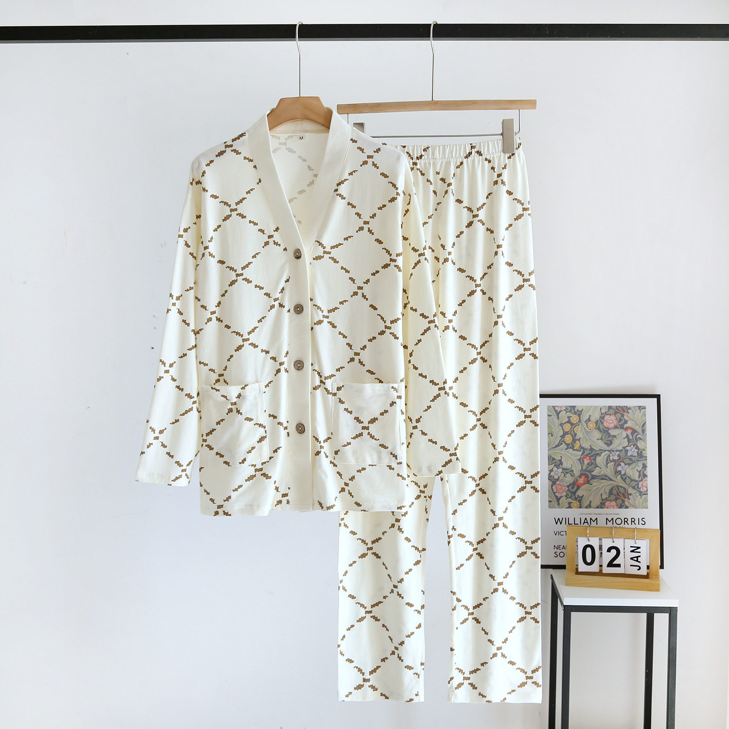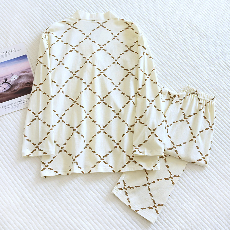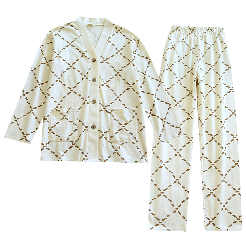 | nameOriginal | Knitted Cotton Women's Pajamas Set Four Seasons Thin Diamond V-Neck Outer Wearing Long Sleeve Trousers Home Suit |