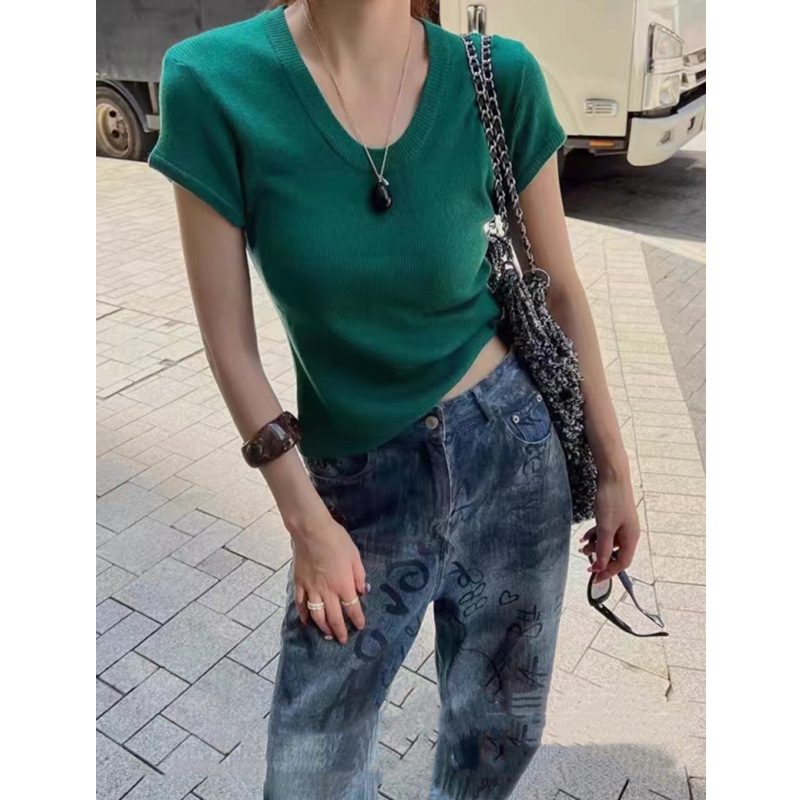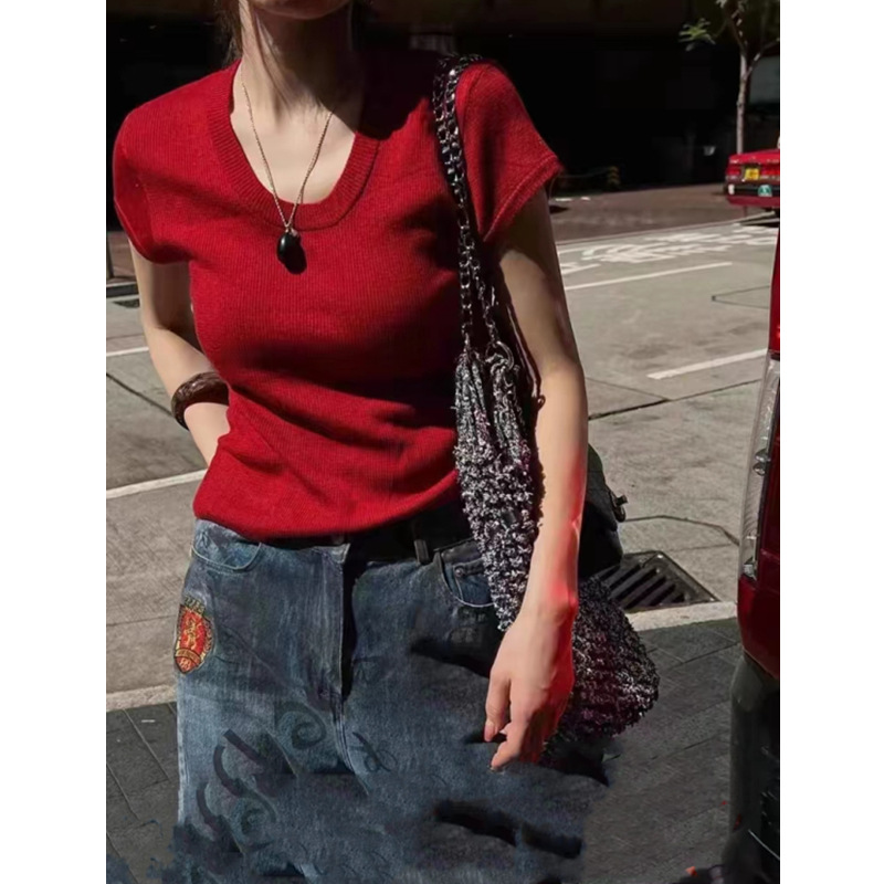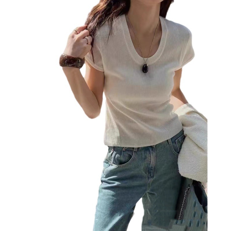 | nameOriginal | Knitted Shoulder Short-sleeved T-shirt 2024 Summer Thin Slim-fit New Slimming All-match Design Sense Top Base |