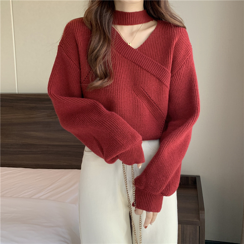 | nameOriginal | Knitwear inner wear autumn and winter women's clothing solid color New design sense niche V-neck red long-sleeved sweater women's top |