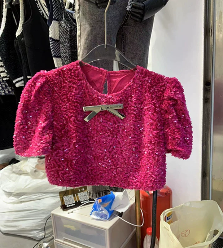 | nameOriginal | Korea Dongdaemun 2024 summer new style heavy industry sequined little woman bow short-sleeved tops for women |