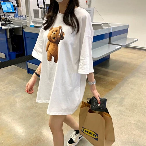 Korea Dongdaemun bear printed short-sleeved ins bottoms missing loose T-shirt women’s mid-length 2024 summer new style
