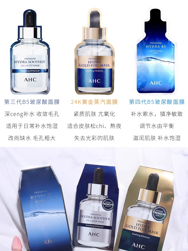 | nameOriginal | Korean AHC facial mask third and fourth generation B5 hyaluronic acid essence hydrating gold mask for pregnant women with sensitive skin 1 box |