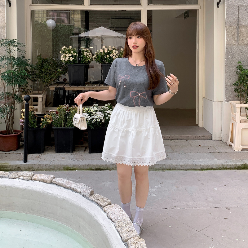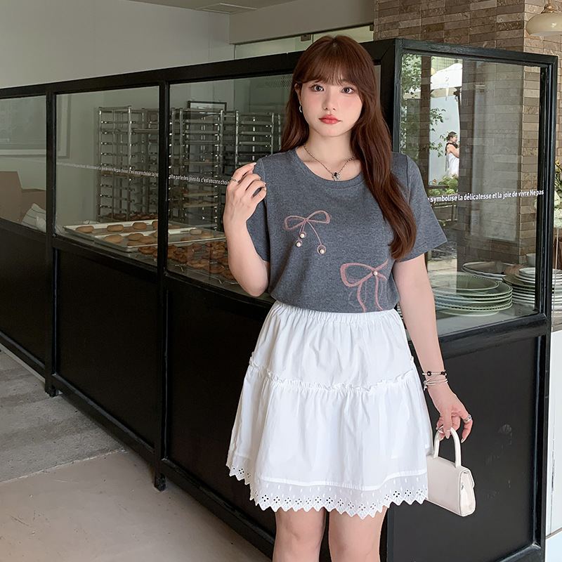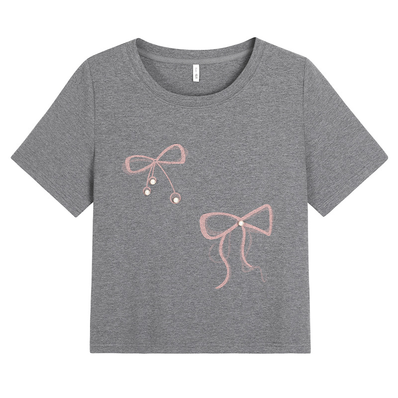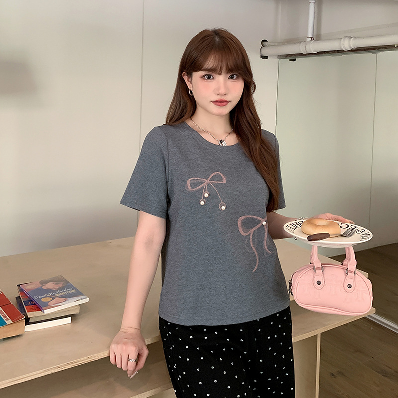 Korean bow printed three-dimensional pearl gray T-shirt women's plus size chubby girl niche slim top 63358