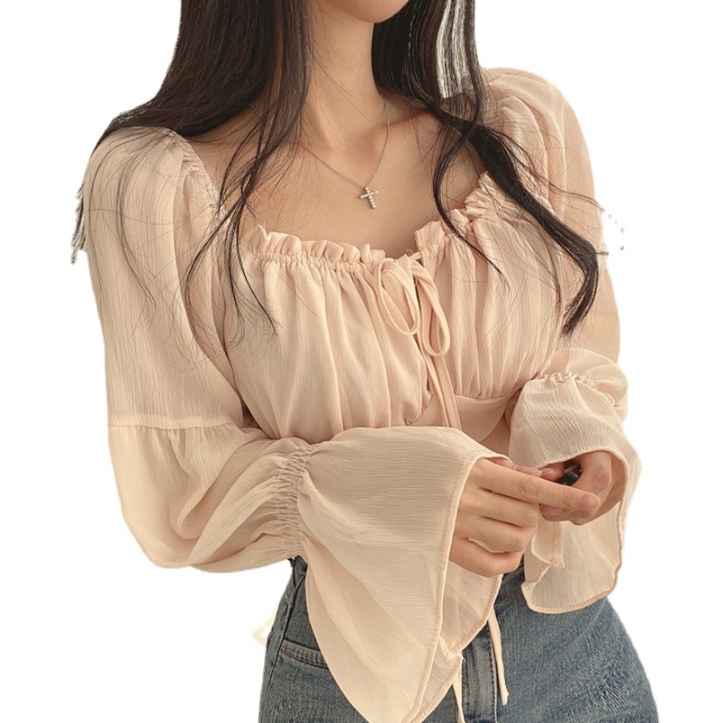 | nameOriginal | Korean chic Early Spring French Ear Lace Square Collar Waist Tight Bell Sleeve Chiffon Shirt Short Shirt for Women |