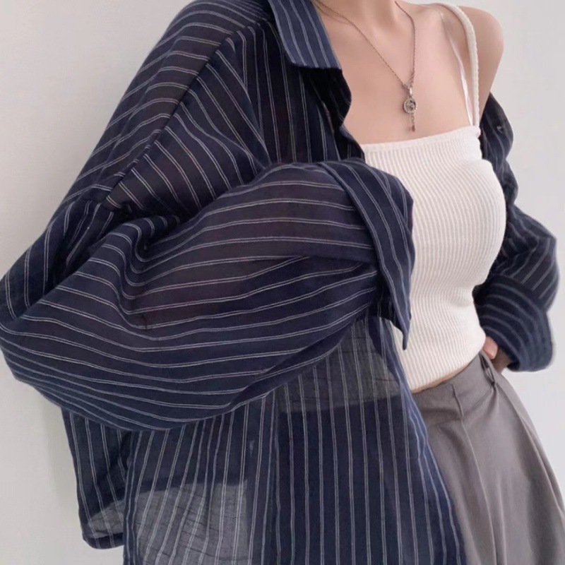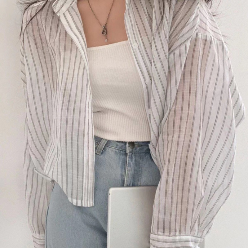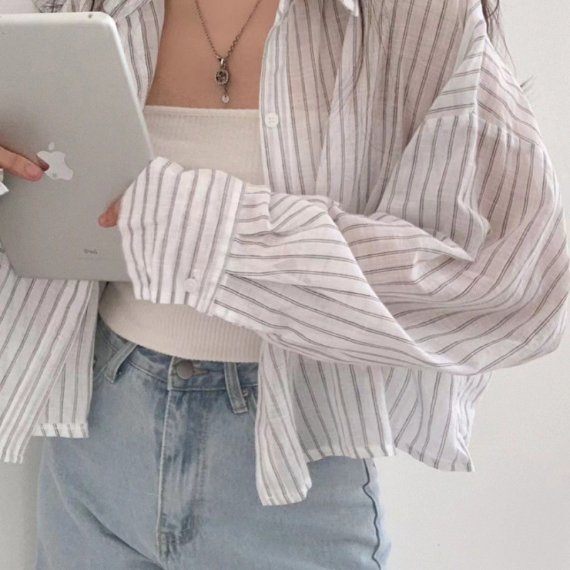 Korean Chic Early Spring Lazy Style Loose All-match Lightweight Sun Protection Shirt Women’s Long-sleeved Short Striped Shirt Jacket