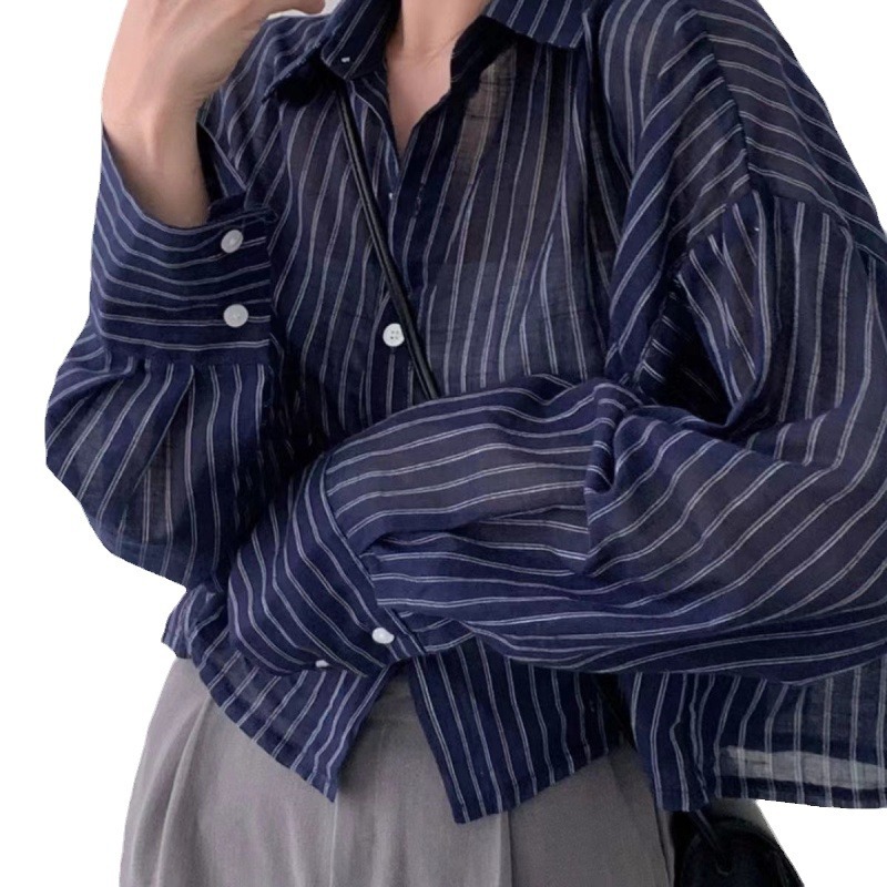 Korean Chic Early Spring Lazy Style Loose All-match Lightweight Sun Protection Shirt Women's Long-sleeved Short Striped Shirt Jacket