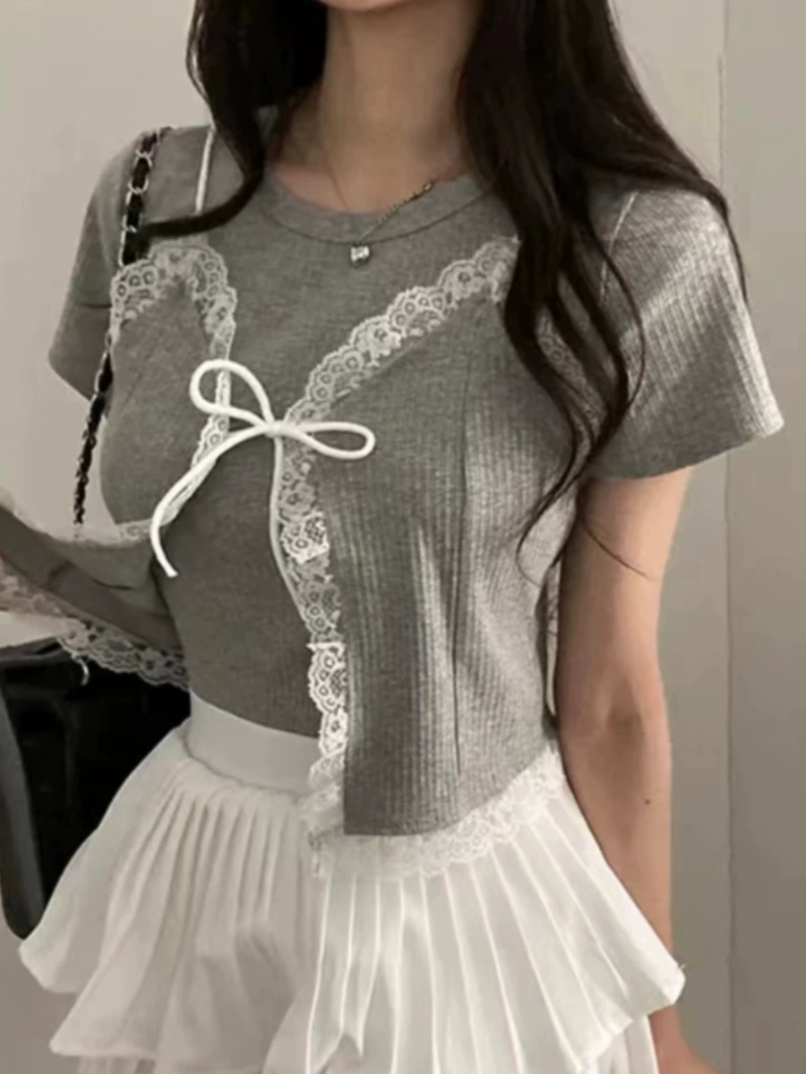 Korean chic summer age-reducing retro style small shirt for women with lace trim small suspender T-shirt fake two-piece top