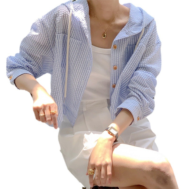 | nameOriginal | Korean Chic Summer Elegant All-match Single-breasted Striped Short Loose Long-sleeved Micro-transparent Sunscreen Hooded Shirt for Women |