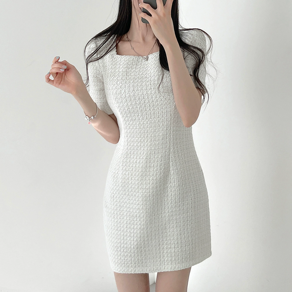 Korean chic summer new style small fragrant square collar mid-length skirt short-sleeved waist slimming tweed dress for women