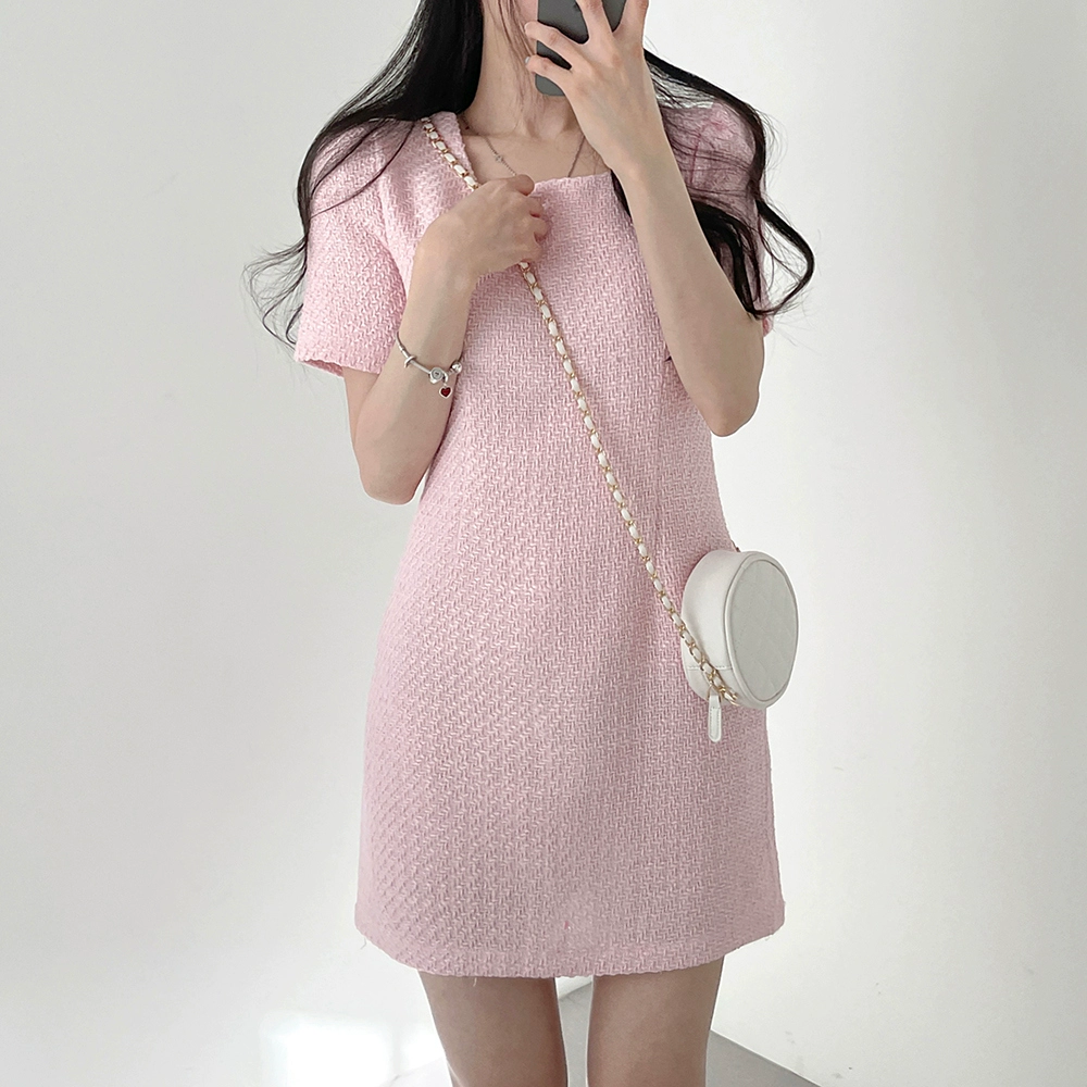 Korean chic summer new small fragrance style square collar mid-length skirt short sleeve waist slim and thick tweed dress for women