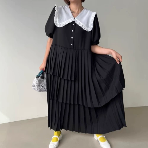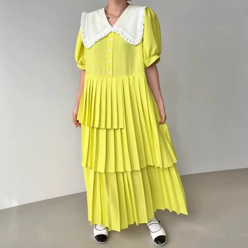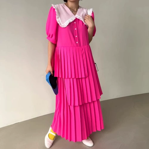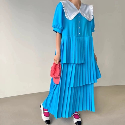| nameOriginal | Korean chic summer niche French large lapel retro layered pleated color slimming loose long dress |