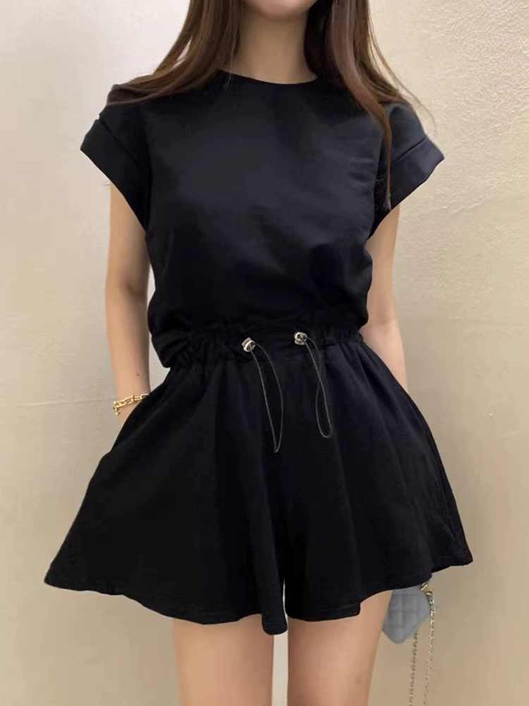 | nameOriginal | Korean chic summer niche temperament rear slit strapped short-sleeved T-shirt top + drawstring wide-leg shorts two-piece set |