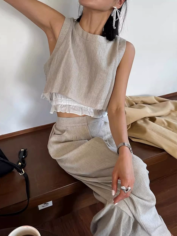| nameOriginal | Korean chic summer retro niche contrasting color splicing lace vest shirt + high waist pleated wide leg trousers for women |