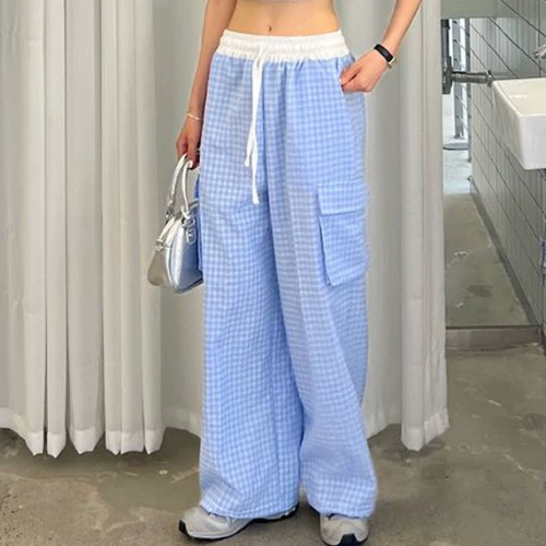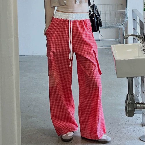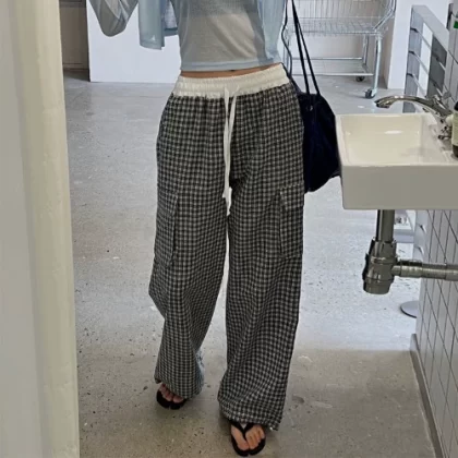 | nameOriginal | Korean chic summer retro niche pine contrasting color splicing design drawstring high waist versatile plaid overalls trousers |