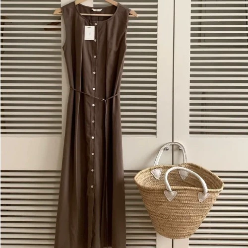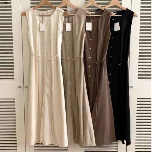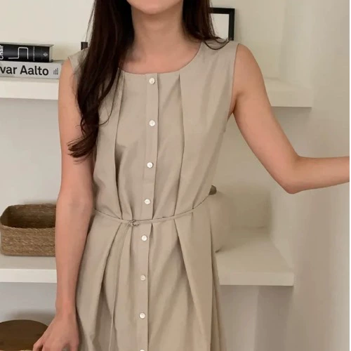 | nameOriginal | Korean chic summer retro simple style round neck single-breasted pleated lace-up waist slimming sleeveless dress for women |
