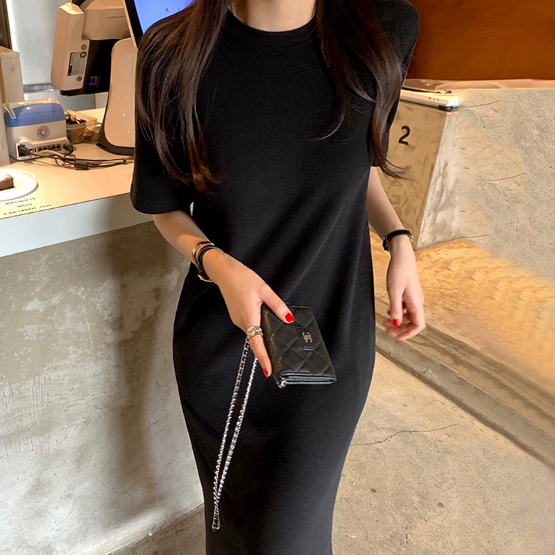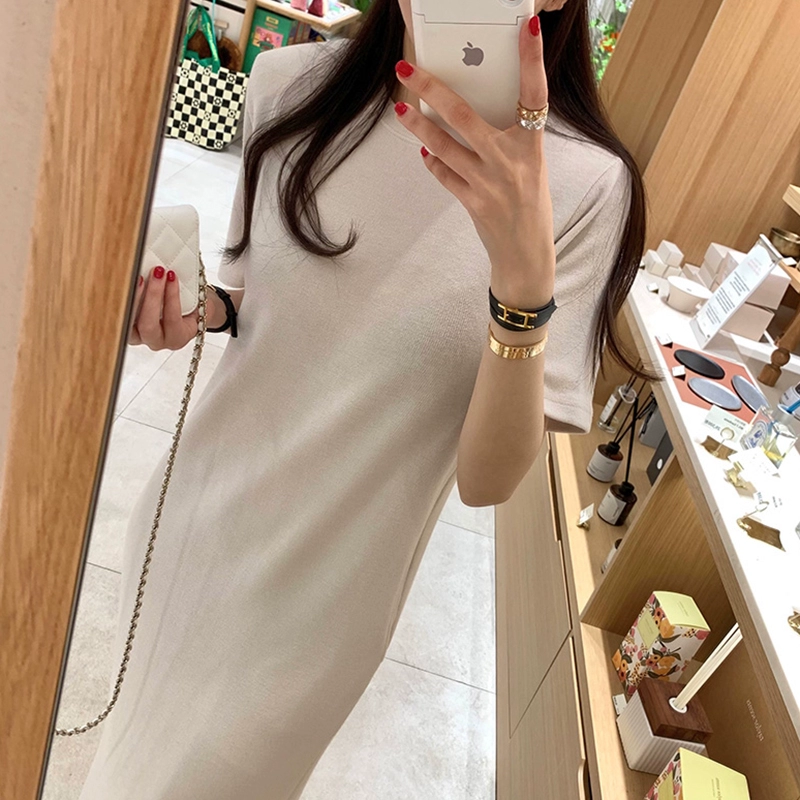 | nameOriginal | Korean chic summer retro temperament round neck slimming mid-length short-sleeved slit knitted dress for women |