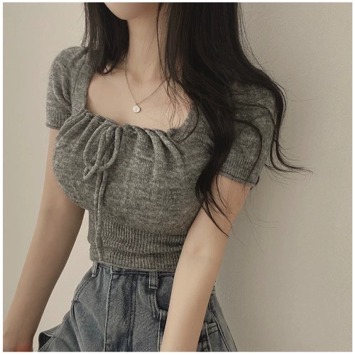 | nameOriginal | Korean chic sweet and spicy slim square neck short-sleeved sweater for women summer design niche drawstring pleated short top |