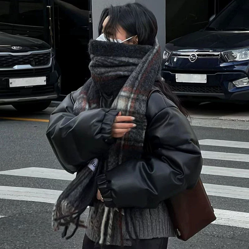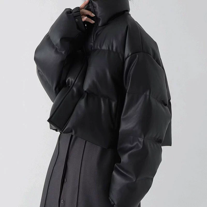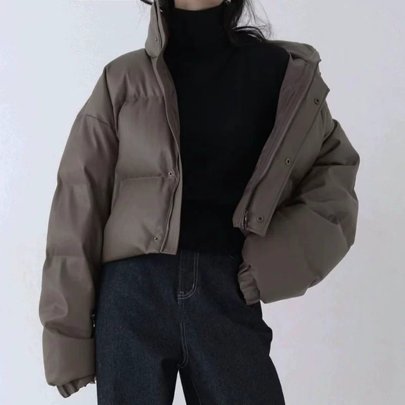 Korean chic winter retro high-end stand-up collar thickened warm loose versatile versatile short PU leather cotton jacket for women