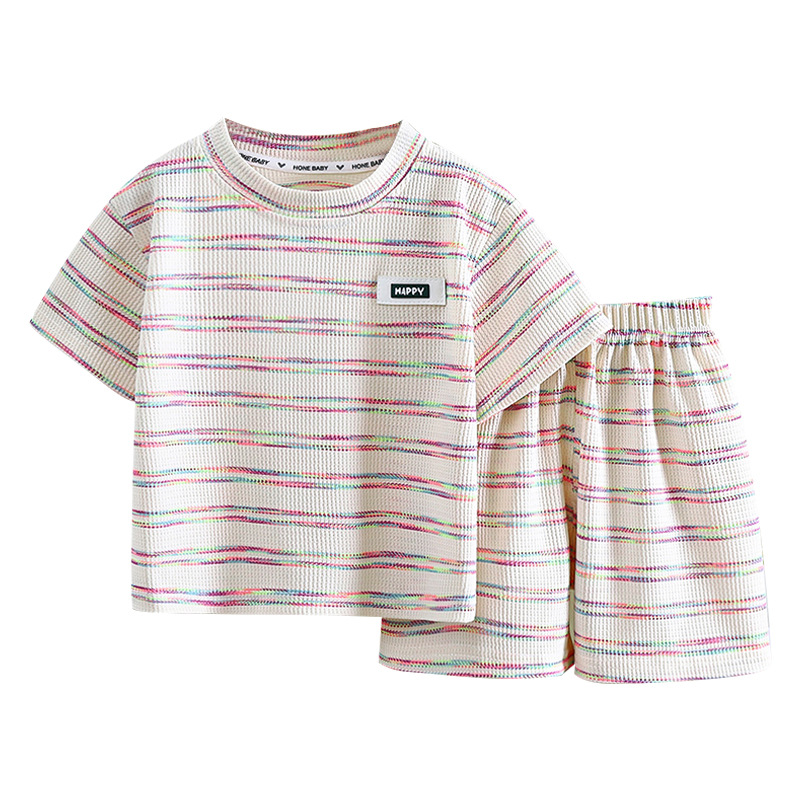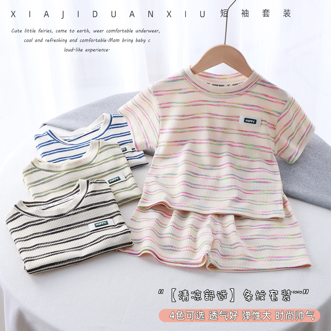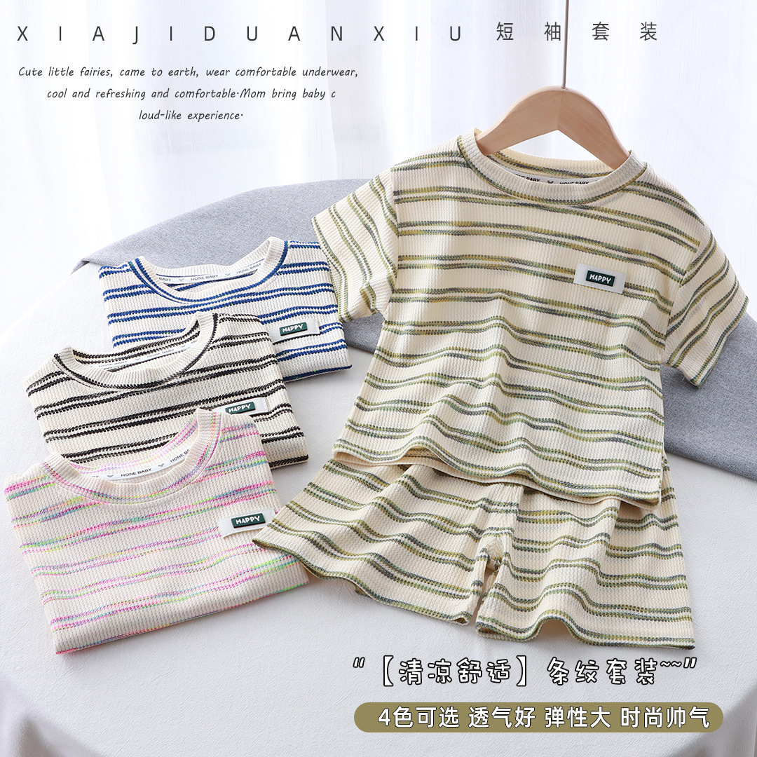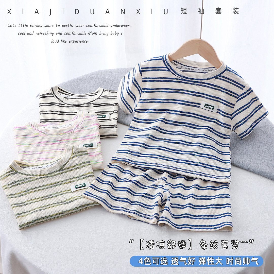Korean Children's Summer Short-sleeved suit 2024 New Children's Striped Western-style Thin T-shirt Shorts Two-piece Fashionable Set