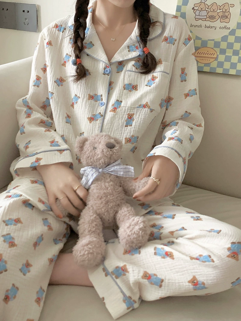 | nameOriginal | Korean cute bear pure cotton gauze pajamas for women autumn and winter long-sleeved trousers loose home clothes two-piece suit spring |