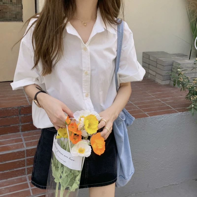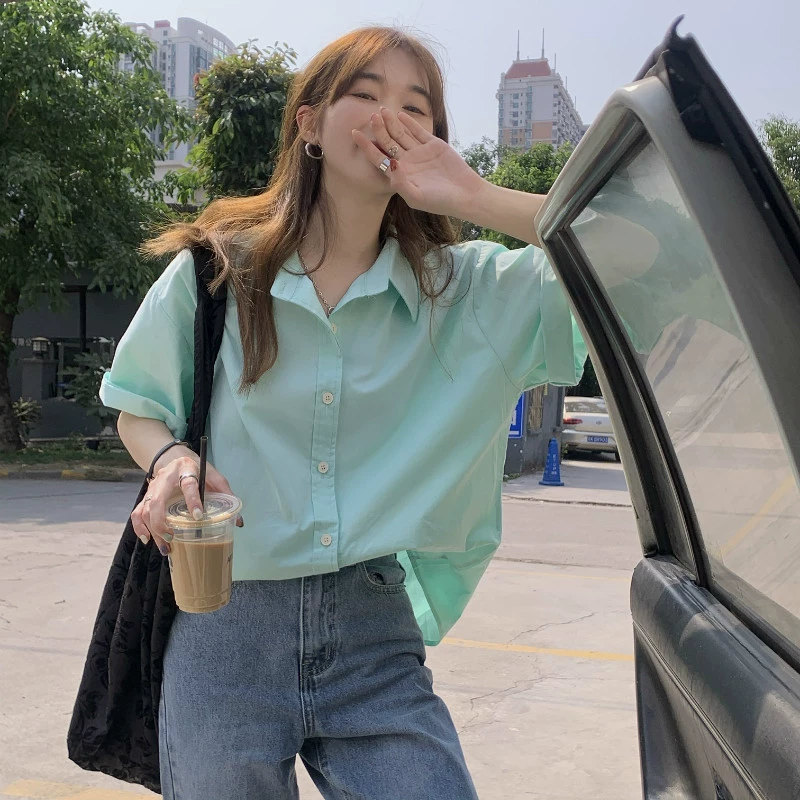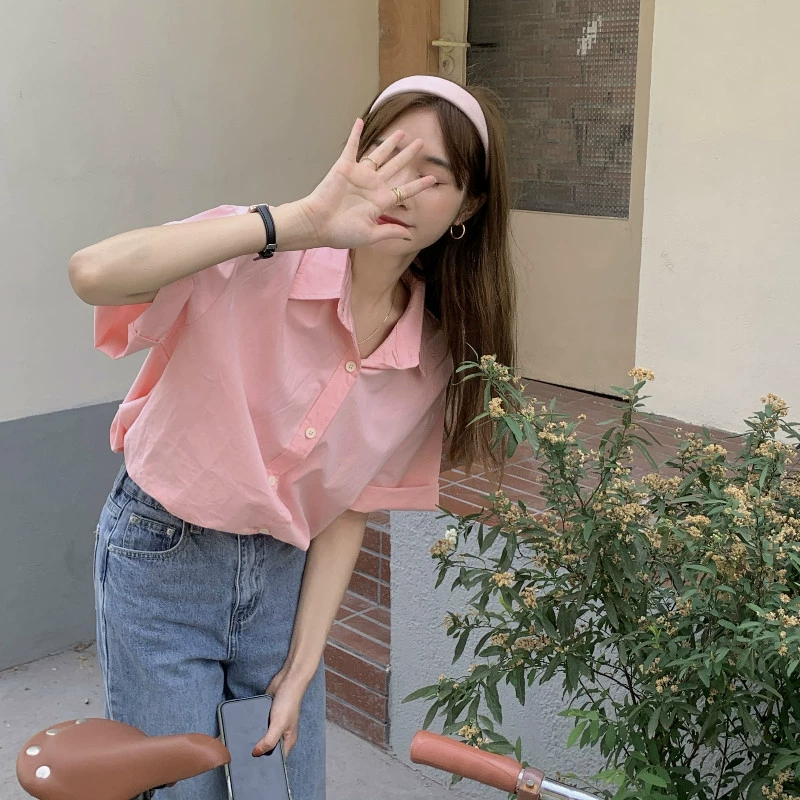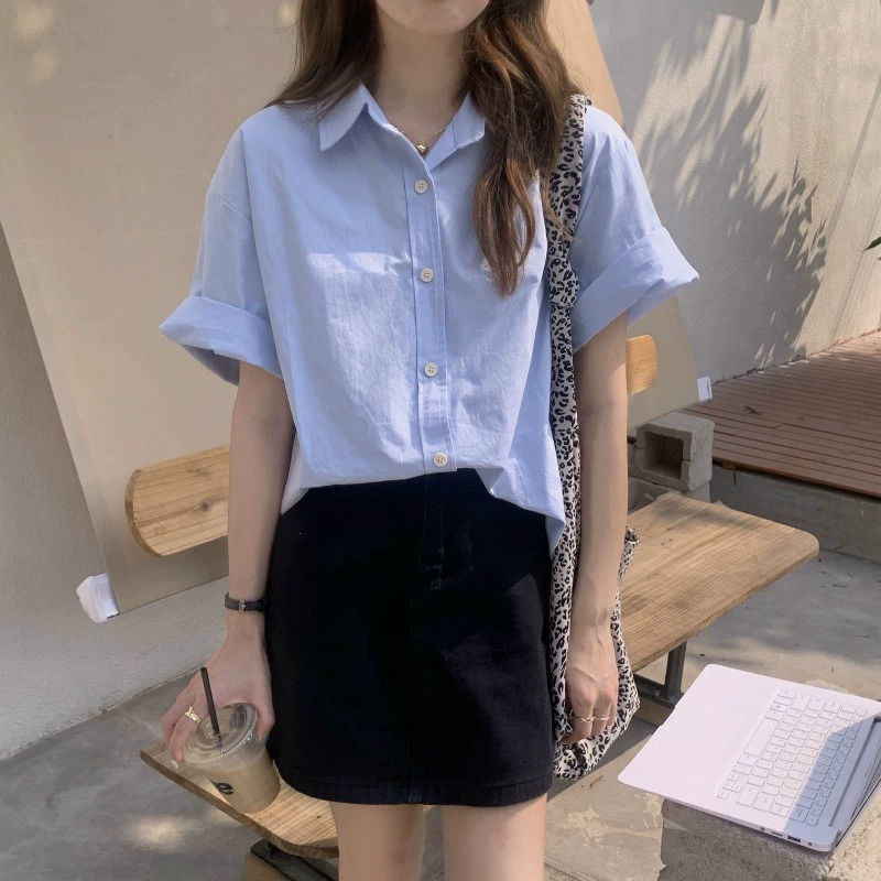 | nameOriginal | Korean design blue short-sleeved shirt for women summer 2024 new casual loose slim lapel versatile top |