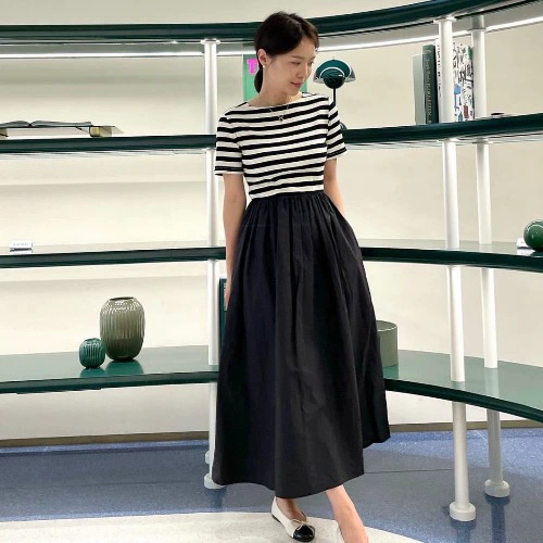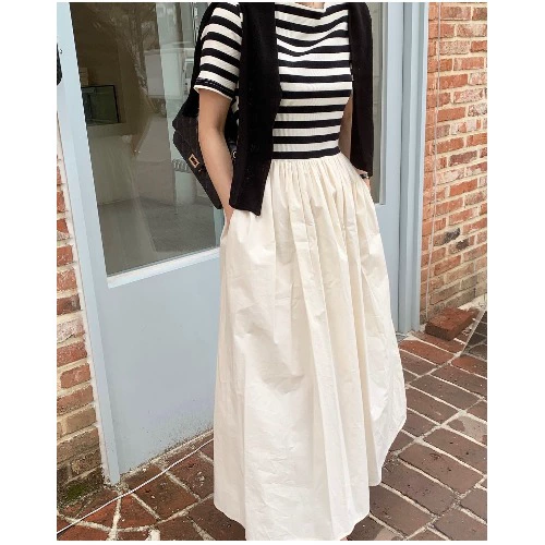 | nameOriginal | Korean Dongdaemun chic fake two-piece striped top sweet age-reducing splicing fabric long dress |