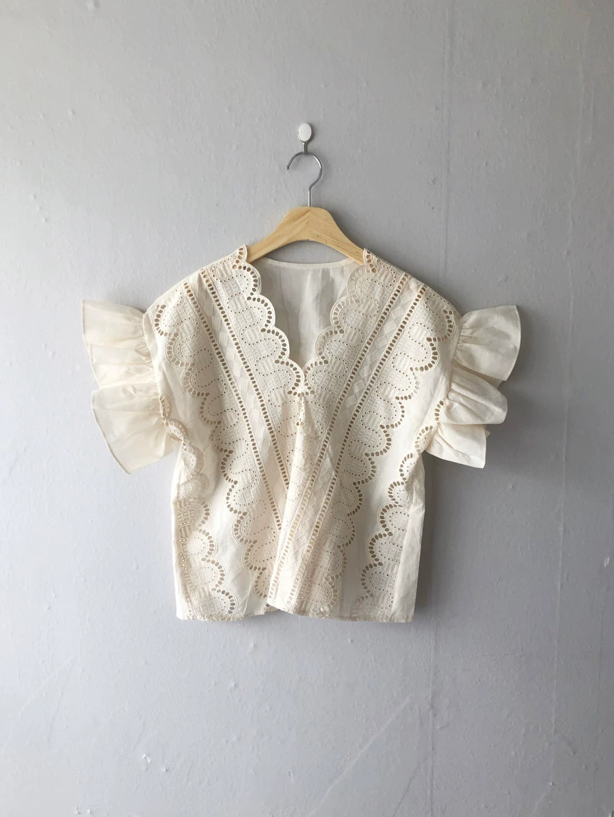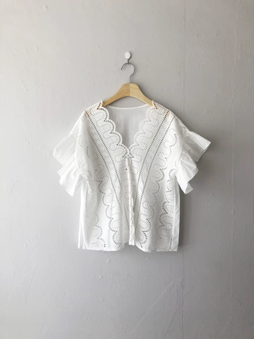 | nameOriginal | Korean Dongdaemun ins2024 spring and summer style temperament lace hollow V-neck fashion loose ruffled short-sleeved shirt |