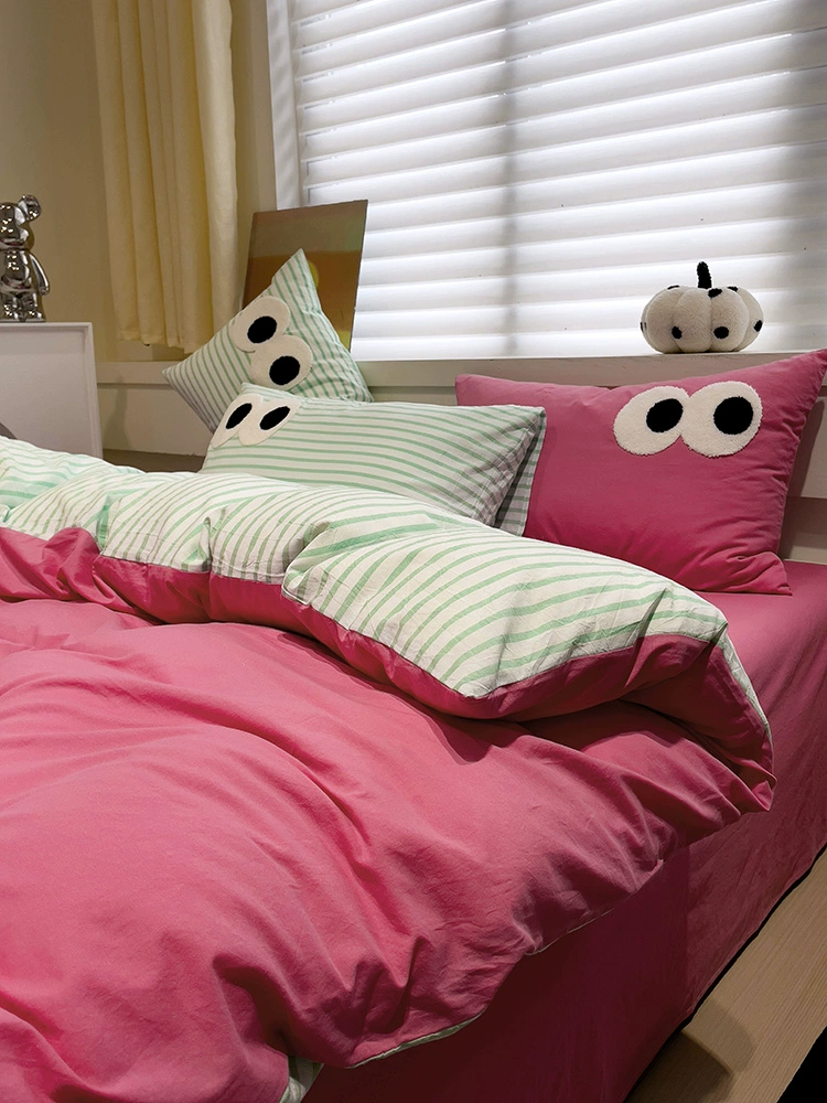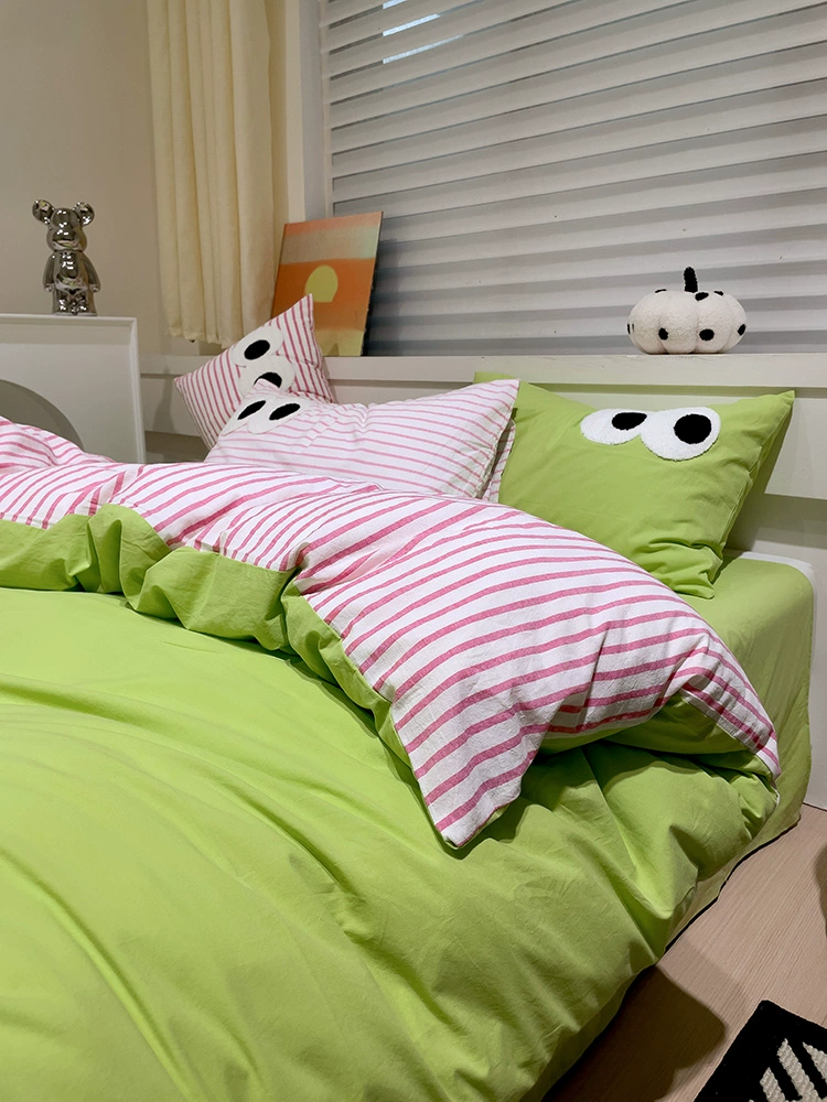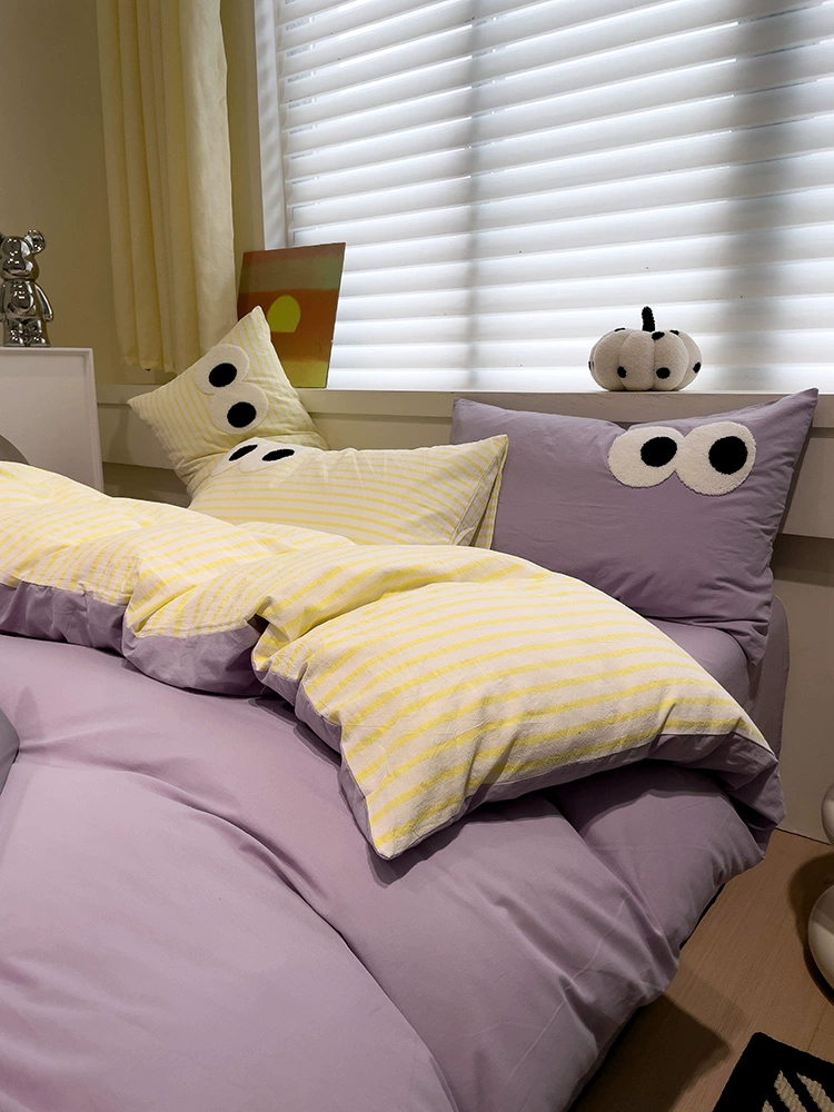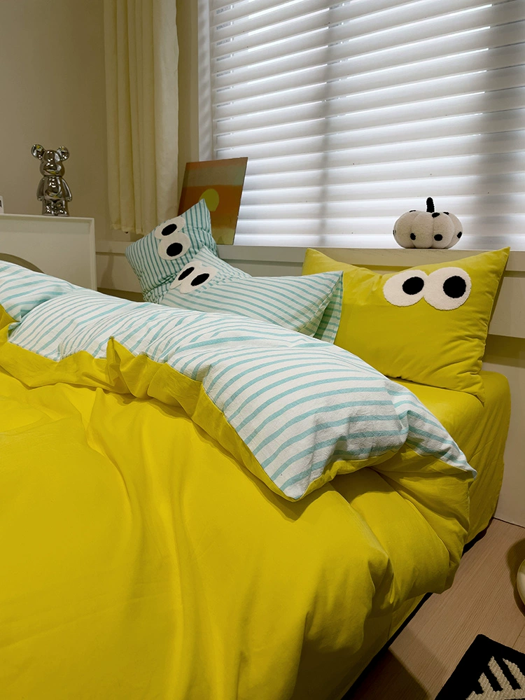 Korean dopamine big eyes striped yellow and lemon yellow four-piece set washed cotton 1.5m bed sheet and quilt cover three-piece set