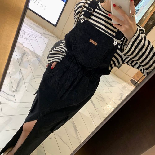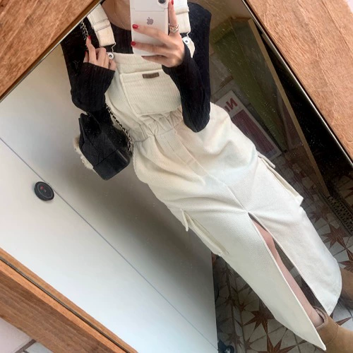 | nameOriginal | Korean ins autumn and winter casual all-match letter label slit suspender dress women's mid-length front slit skirt |