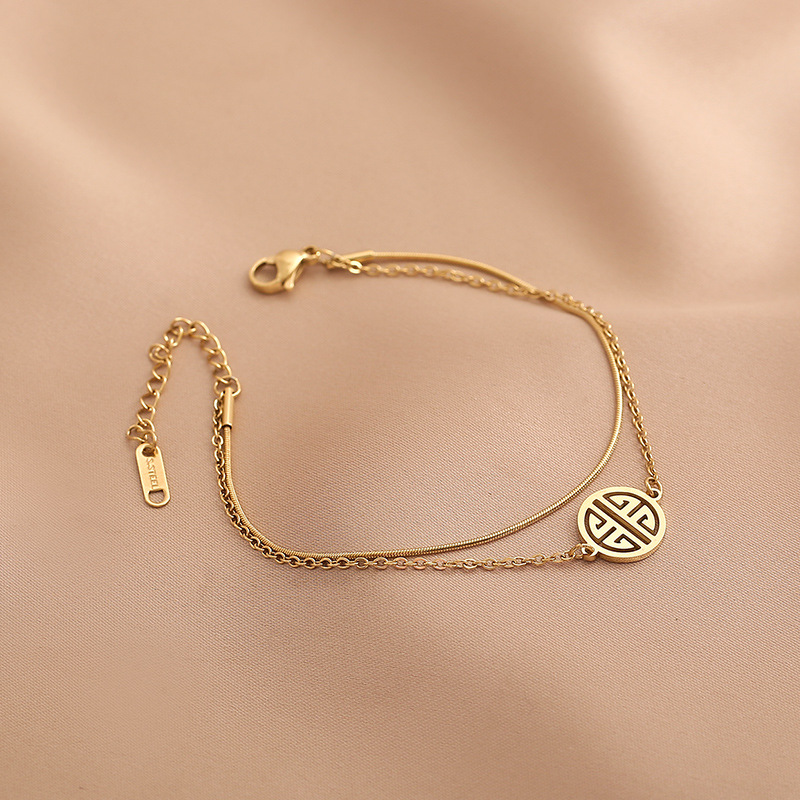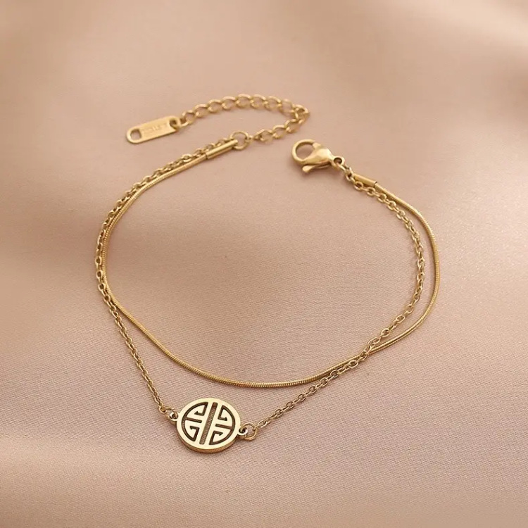 Korean ins Cold Style Simple Temperament Fu Brand Anklet Lucky Personality Round Brand Double Layer Titanium Steel Gold Anklet for Women