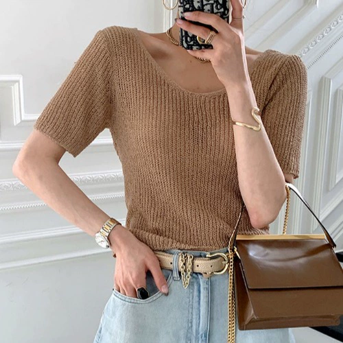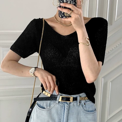 | nameOriginal | Korean ins summer careful twist V-neck design front and back two-wear loose thin ice silk short-sleeved sweater for women |