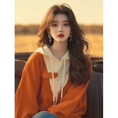 | nameOriginal | Korean orange and white spliced long-sleeved hooded sweatshirt for women 2024 autumn and winter new design niche thickened jacket top |