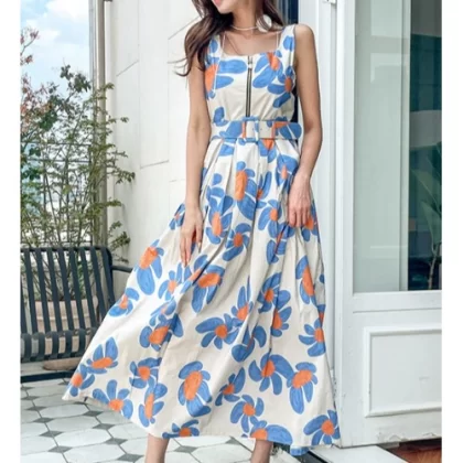 | nameOriginal | Korean Ouni light luxury print casual French elegant temperament zipper neckline long suspender dress with belt |