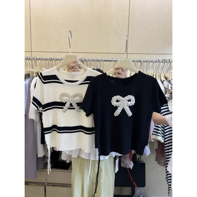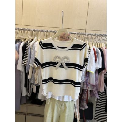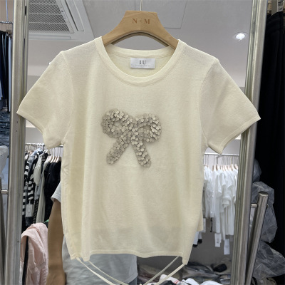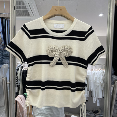 | nameOriginal | Korean Style 2024 Summer Thirteen Line Thin Summer Knitted Short Sleeve Bow Sequin Design Drawstring Top for Women |