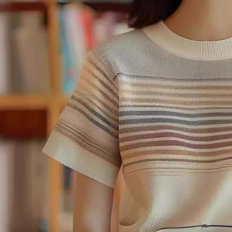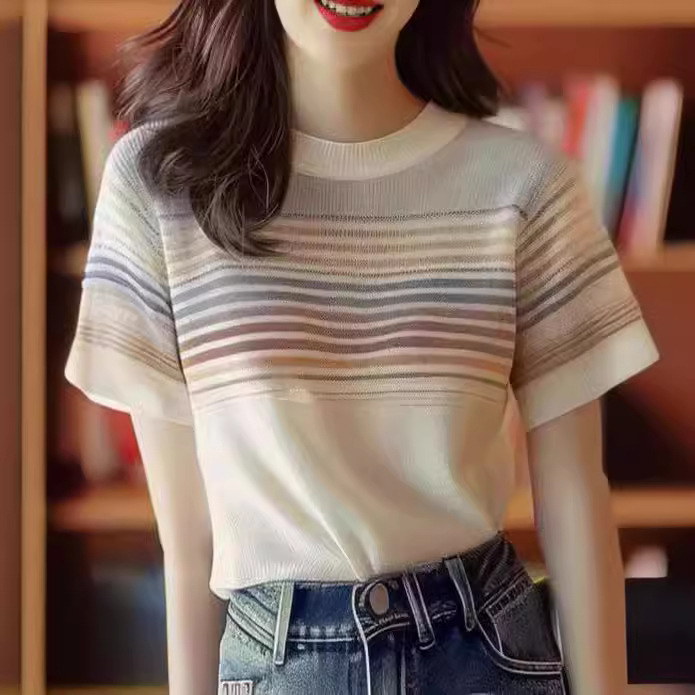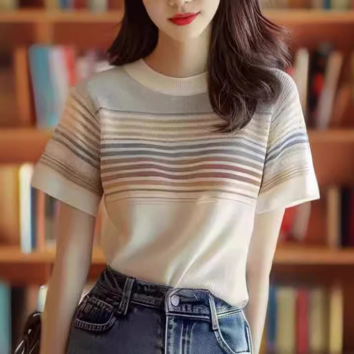 | nameOriginal | Korean Style Age-Reducing Ins Colorblock Striped Sweater Women's 2024 New Style Elegant Commuter Slimming All-Match Short-Sleeved Top |