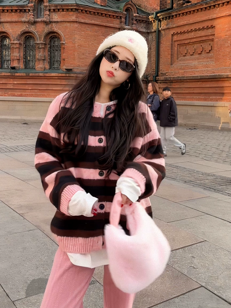 | nameOriginal | Korean style, age-reducing, pink striped knitted sweater, cardigan jacket, women's autumn new style, unique and chic top |