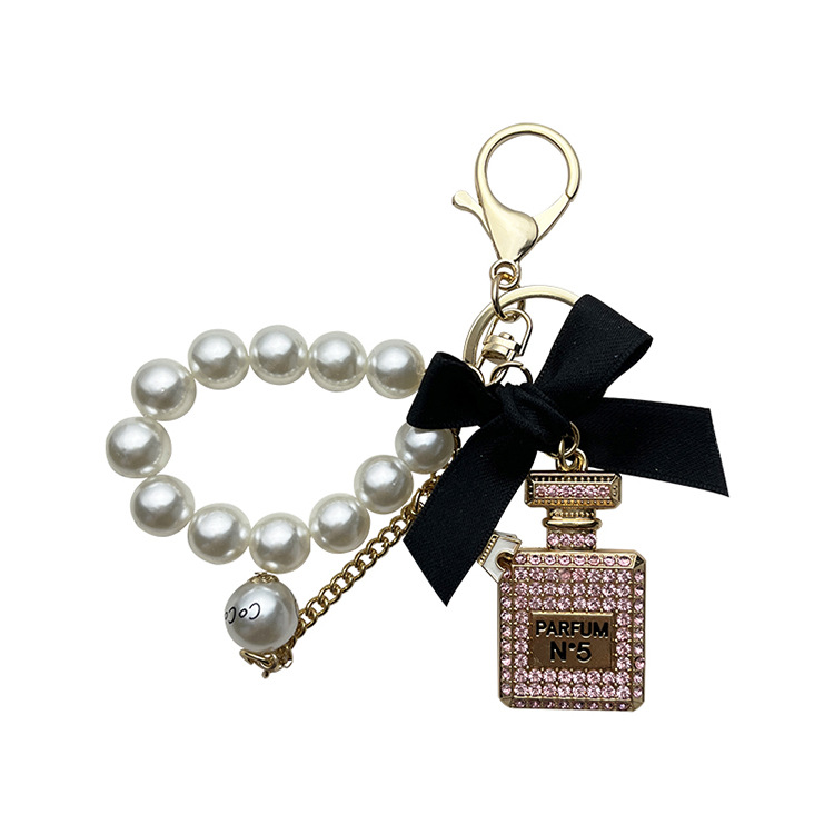 | nameOriginal | Korean-style alloy diamond-encrusted bow perfume bottle keychain creative pearl chain bag pendant exquisite key chain women |