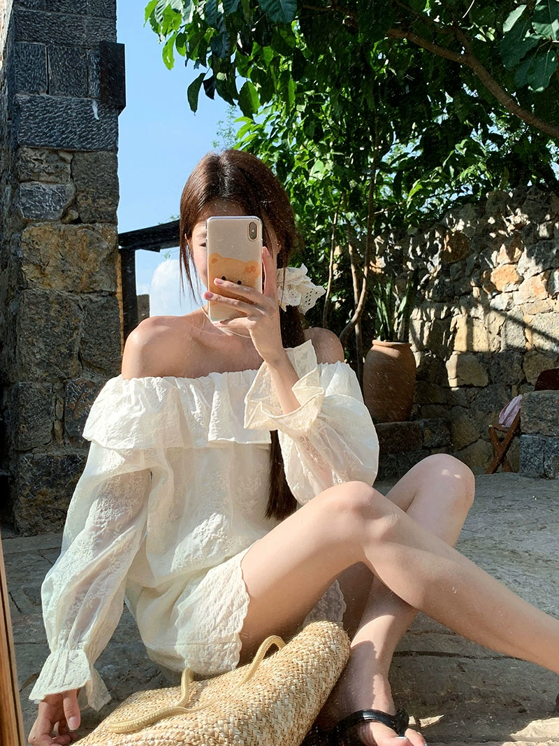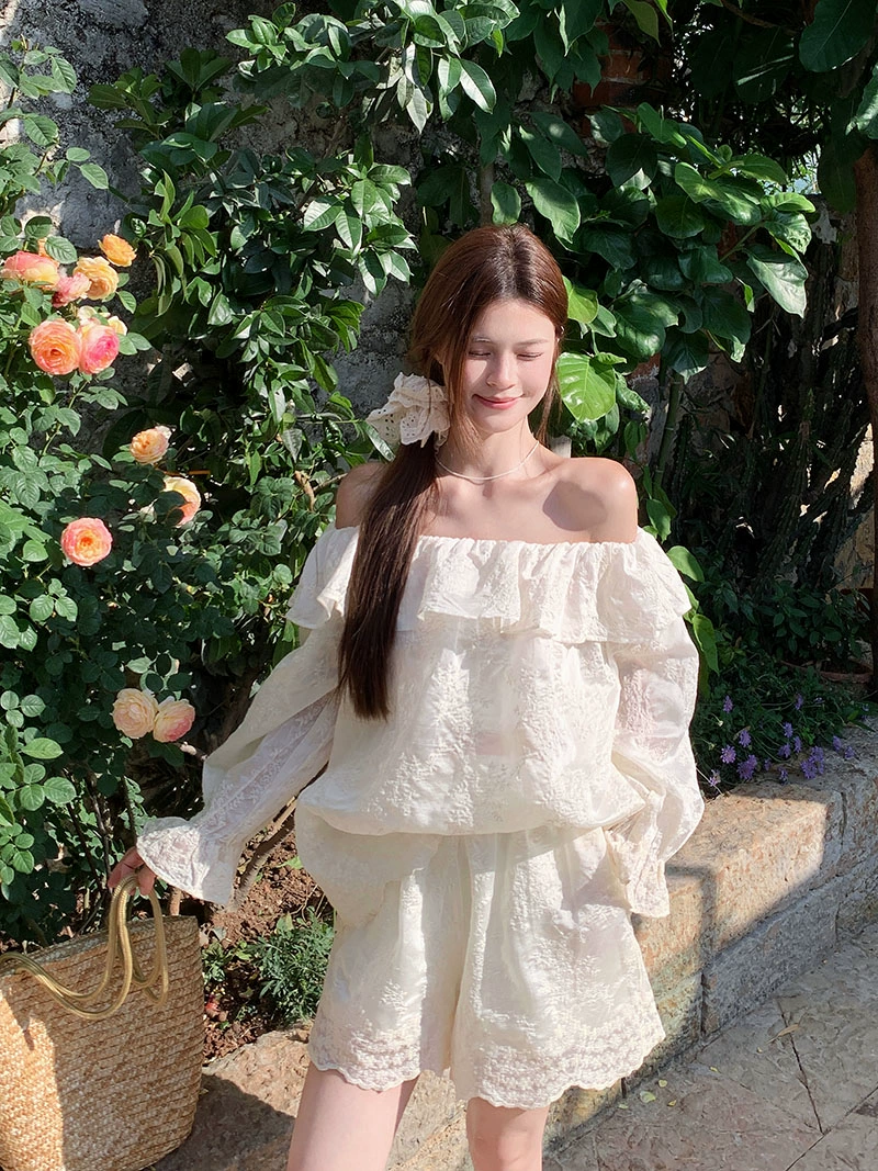 Korean style beautiful gentle style suit for women summer 2024 new one-shoulder long-sleeved shirt lace shorts two-piece set