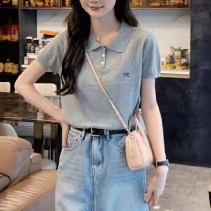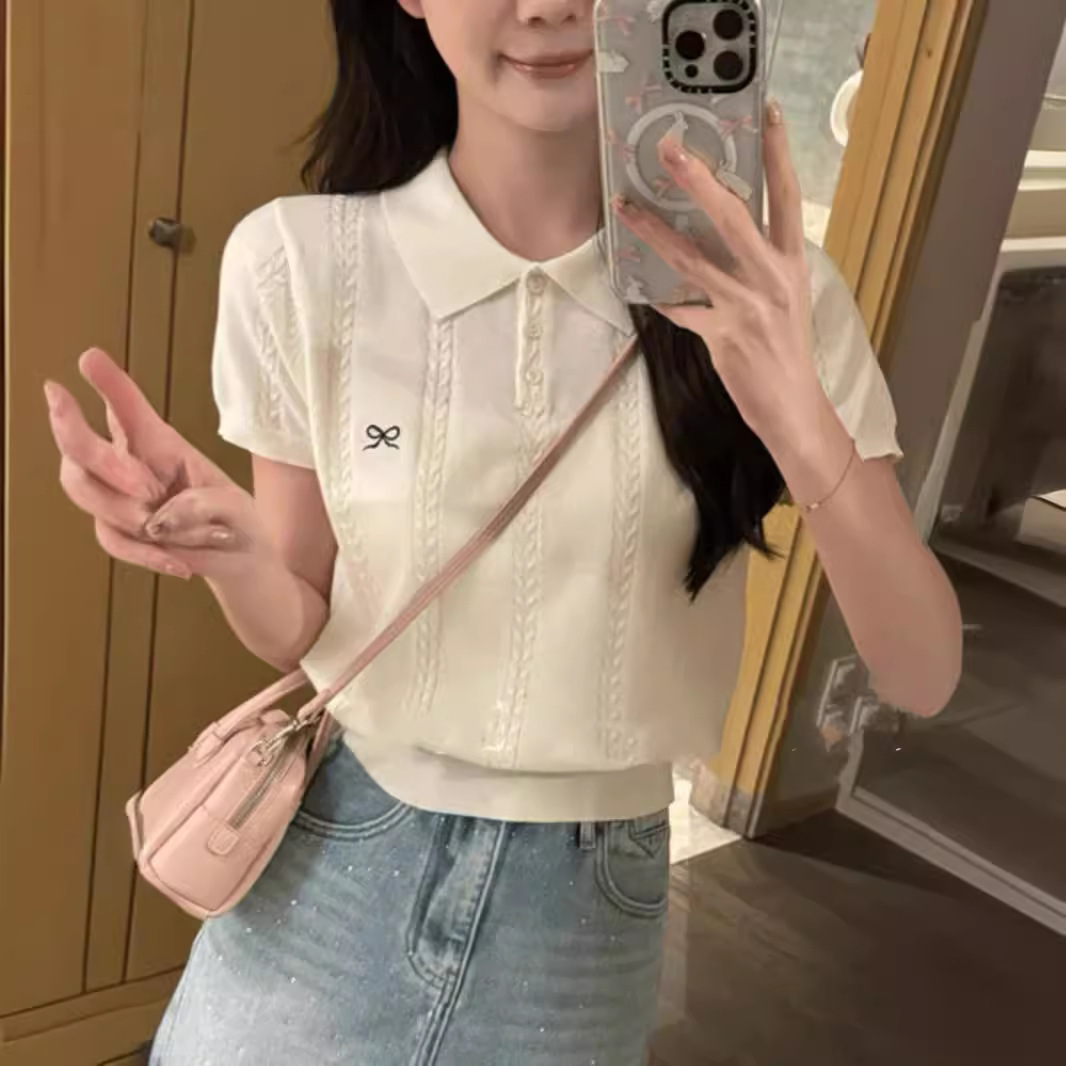 | nameOriginal | Korean Style Bow Embroidered Polo Collar Short-sleeved Sweater Summer Age-reducing All-match Short Top Women's Trendy |